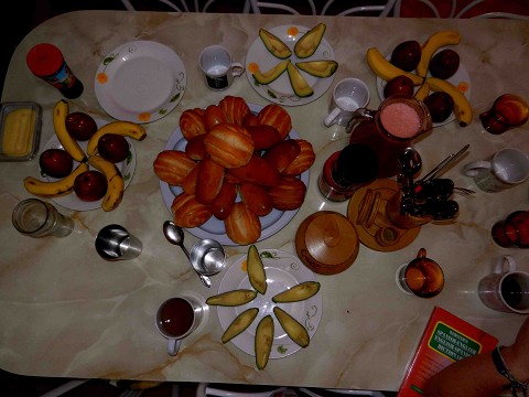- Breakfast- bread, yogurt, coffee, fruit, and jelly.