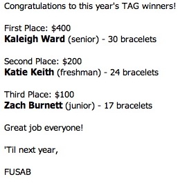Each year, Furman’s Student Activities Board hosts a campus-wide game of tag.  In this game, everyone who signs up (about 180 people this year) receives a bracelet in their Furman mailbox on Monday with someone else’s name on it.  You then start searching for that person so that you can tag them and then take their bracelet and search for their target.  If they have already tagged people, you get to take all of their bracelets and continue moving down the line.  Whoever is still in the game and has accumulated the most bracelets by the end of the week wins!  The challenge here is that while you are searching for your target, some unknown stalker is searching for you.  You have to be super sneaky about how/when/where you eat, go to class, sleep, etc.