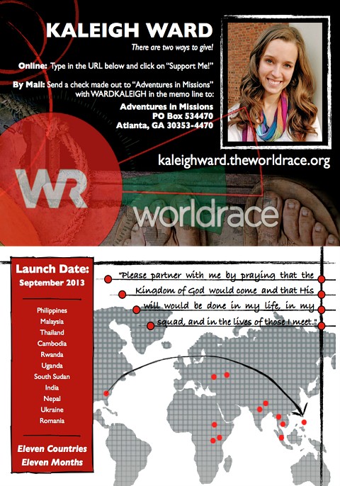 This week, I was able to get information cards printed about my world race to hand out to anyone who asks me about what I'll be doing next year.  I was extremely blessed to have a close friend, Alyssa McNaughton, design these for me.  Then, I was further blessed (and surprised!) when my mom offered to pay for an order of 700 cards!
