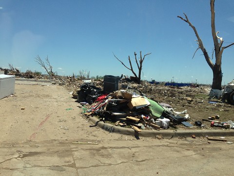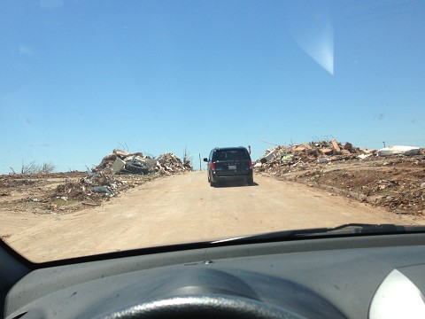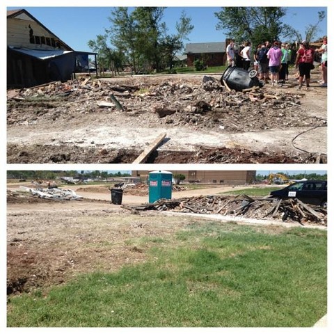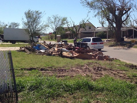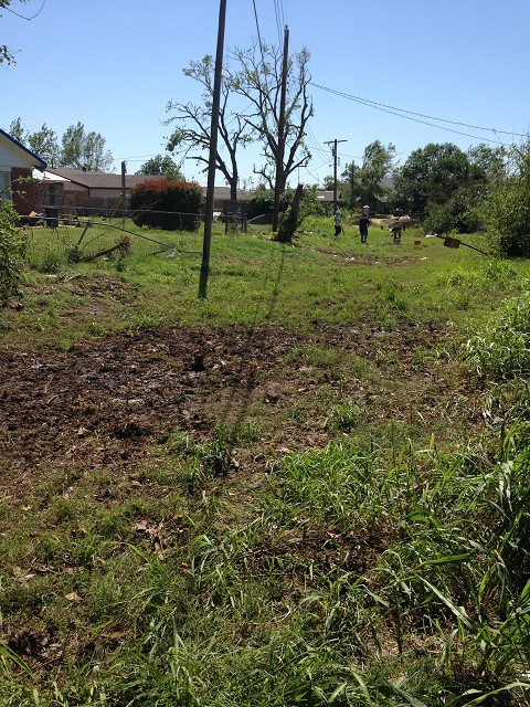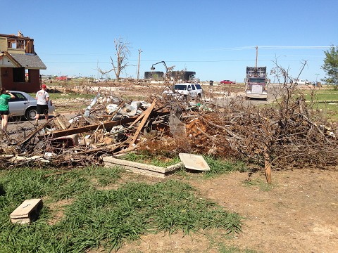 We met Mr. Marty, who hid in his home's hallway with his wife during the storm. They decided to put on their motorcycle helmets and the decision saved their lives. When the walls fell on top of their heads, they were able to pull their heads out of the helmets which were wedged between debris. They would have died without that protection. Their yard was littered with debris from the local middle school… including entire lockers! Mr. Marty was very upbeat and excited about the new house (and storm shelter!) they would be building soon.