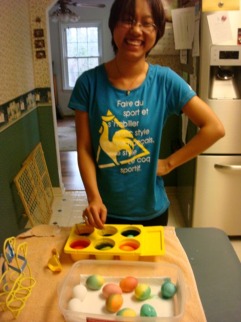 "I enjoyed my first easter, the first time dyeing eggs and first easter basket 🙂 The thing cross my mind these days is what eating and laughing means to me. I was watching funny Chinese shows all day long and eating all the time even I was not hungry. I felt I was doing them because I was homesick and feeling empty without chinese foods and language environment. I was struggling about my identity. Am I half American half Chinese? Both Chinese and American or neither? But this morning , when we were singing in church, I just realized my identity is Jesus. Again, I just found peace in my mind. :)"
