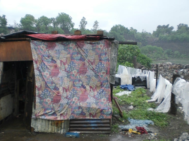 or leaking through a tin or cardboard roof, the smell of trash all around, and little