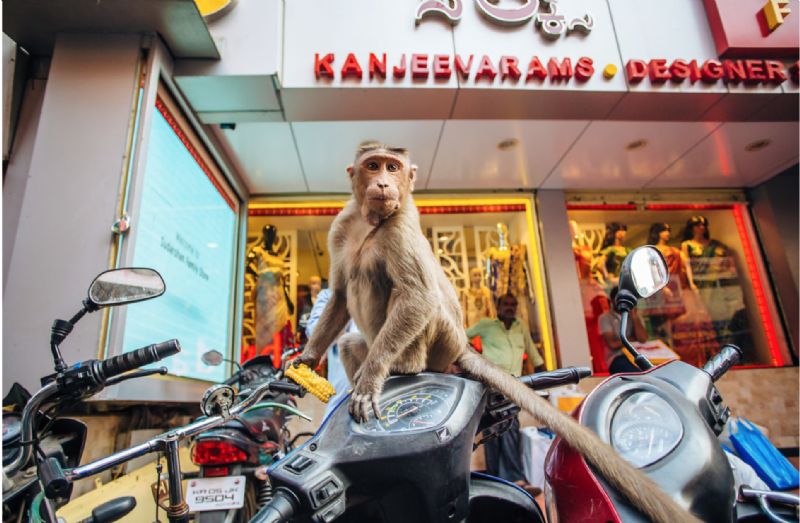 Saturday, we crammed all four of us into a tiny three person rickshaw and told them “downtown.” When we arrived, we started walking in the direction of what we thought was an open air market. Each city block/alley was lined with one type of merchandise: the lighting road, silk road, food road, etc. It was awesome. We found an old man cutting a weird fruit and had a bite, we saw a monkey sitting on a motorcycle nibbling on a corn cob, we saw cows decorated with bells and tassels. We heard temple bells and chants and horns. Lots of car horns.