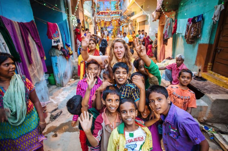 I thought this was magical, but I had no idea what we were in for. We walked down this long street of people constantly asking us to take their photo and strange stares because we were white. Everyone wanted their photo taken and they obliged. We came to an alley with a canopy of orange and yellow flower garlands and lights. We turned the corner and saw a few children playing with tires. They got their photo taken, spoke great English and told us “Come on!” inviting us into their neighborhood. We entered this alley with the brightest colored homes I’ve ever seen. Every doorstep was painted, every house was a different color and every person was clothed in the most bright and beautiful saris. We kept going deeper and deeper into this neighborhood that was celebrating a festival.