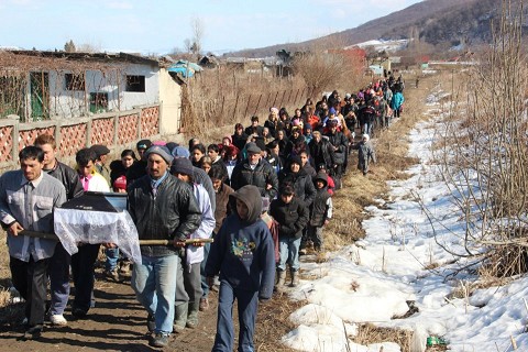 We prayed for an elderly Gypsy man named Albie the entire month. Right before we left, he passed away. We attended his outdoor Romanian funeral, complete with an open casket and wailing women. After a few words were spoken, we followed the crowd – and the casket – through the melting snow and mud for about half a mile. Then, we ascended a hill of mud to a hillside cemetery (of sorts). And yes, the made the ascent as well. Once we sang, listened to some men speak, and buried Albie’s casket, we walked back down the hill, where we were immediately greeted with glasses of orange Fanta and buttered bread topped with salami and pickles. Then we stood on the side of the road with 50 or so Gypsies and ate while some of the men took shots of vodka off to the side.