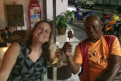 Then he came back with something in his hand. He sat down next to me and handed me something wrapped in leaves. I was unsure what was happening. I asked one of the hostel employees what he was handing me. He replied, “Sticky rice and bananas.” Since he did not seem concerned, I assumed it was safe to eat. I asked one of the employees how to say thank you in Thai and thanked the man for his kindness. The man and I watched the game while I ate sticky rice and bananas wrapped in banana leaves. He played a few games with my teammates. Eventually, he also left.