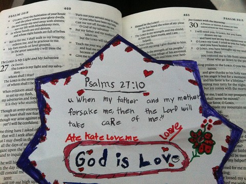 The children have given me many gifts while being here, mostly handcrafted art! Here is a picture of the star that one of the girls gave me with Psalm 27:10 on it “When my father and mother forsake me, then the Lord will take care of me”. I look at this verse that she has written while looking at it written in the bible. This beautiful child of God knows what this verse really means, she knows who she belongs to and she fights to believe it everyday through faith. I want to take God’s Word like this sweet sister does, I want to really believe and act on what the bible says and not skip over parts. So when God says over and over again in the bible to feed the hungry, take care of the widows and orphans, sell everything you have and give it to the poor and follow HIM, love justice and mercy, correct oppression, love your neighbor as yourself; I want to DO these things not just once or twice but I want it to be my life, I want to start living out the Word of God with full faith, conviction, and assurance, I want to do all of this with JOY because for my sake, though Jesus was rich he became poor, though I was naked Jesus clothed me with HIS righteousness, though I was blind Jesus gave me His eyes to see, I CAN SEE and I want others to SEEEEEEE, Jesus He is so beautiful and heaven is so real and He means what He says, LOSE YOUR LIFE and YOU WILL FIND IT!! Church arise, it’s time to wake up the sleeping beast, the CHURCH, we need to help our brothers and sisters, choose to see and hear the cries of this world, and choose to answer the tugging on your leg, the tugging on your heart to “LOVE ME” (like the note above), whoever the ‘me’ is in your life.