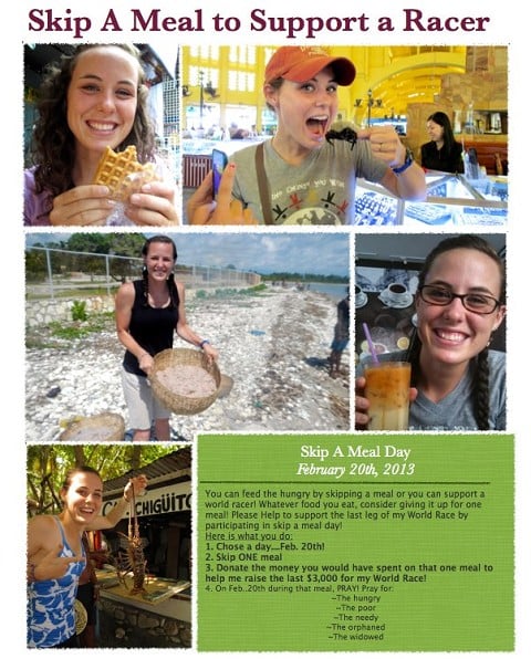 You can feed the hungry by skipping a meal or you can support a world racer! Please help to support the last leg of my World Race by participating in skip a meal day!