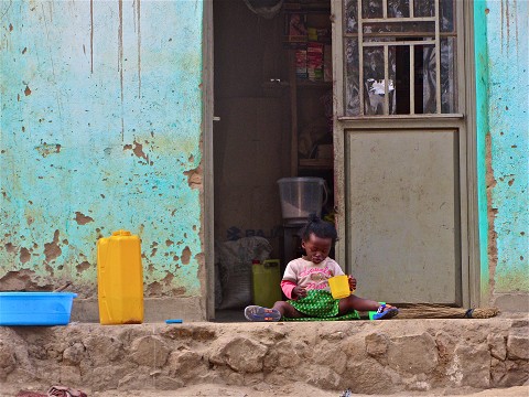 After our run it’s time to start the walk to breakfast. It’s a 30 minute walk to and from where we eat all our meals. The first half of the walk I try to stare at the ground because I can feel the eyes of all the adults in town watching the 8 Muzungus walk down the road. But the second half is when the kids come again! Every day we walk past a little dirt mound where 3 toddlers wait for us to come and touch their hand as we pass by. Then as we make the turn up to Pastor’s house where we eat, the neighborhood kids sprint down the street towards us to give us hugs around our legs. I look forward to this everyday; not to mention breakfast is delicious! Bananas, Chipati (flat bread), hard boiled egg, and milk tea.. same meal each morning.