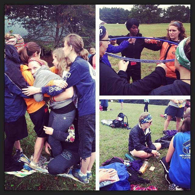 Then for the third activity I was placed on a new team of 7, though it included one person from the hula hoop team. This team was required to use our collective belongings from our backpacks to create something. The first instruction was “Build,” followed by “Change.” So we piled all our books, bibles, journals into the shape of a Y for Y squad. We then changed it to be the shape of a cross. Then we were told “Improve.” So we piled our backpacks around the cross, representing laying our burdens at the cross. We placed a black jacket in front, representing our life in sin, and leading from from the black jacket to the cross was a red sweater, representing the blood of Jesus. Then came the last instruction, “End Well.” So we place a green folder a little past the cross, with green symbolizing new life in Christ. We then had a blue jacket (Rivers of Living Water) leading from the green folder, past the pile of backpacks, with a notebook saying “God bless you” on it, symbolizing how we are called to bring this new life in Christ to the nations. Yay! So good! we were very proud of the meaningful creativity.