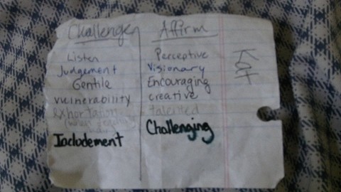 We decided to put one person at a time in the ‘hot seat’ and use one word to affirm them. Jamie(be sure to click on her name and ch-ch-check out her page) was the first one and we all affirmed her and then we decided to throw in one Challenge word (synonym of Constructive Feedback), then she got so convicted by them that she wanted to write them down……….. WHICH