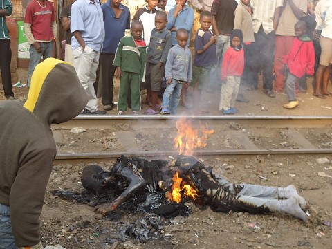 This man was burned alive in the central area of Kibera for all to witness.