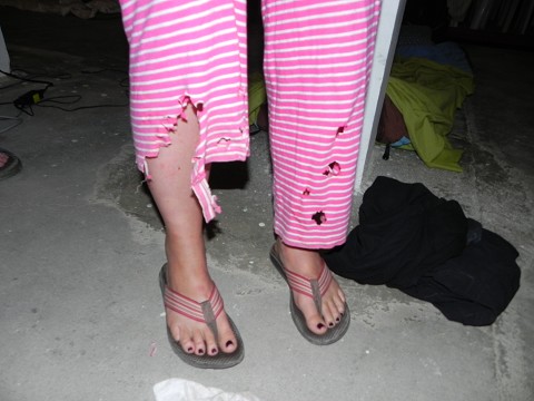 In my last blog I wrote that I seem to be the only one attracting all the critters. This story proves that fact to be true. I put on my pajama pants the other night to find the bottom had been completely eaten. I wore these same pajamas the night before with not one tear in them. With only one day some little critter came and decided to have a feast with my pjs. The critter still remains unknown. Have a good laugh. My team and I sure did 🙂