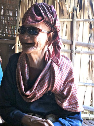 Oh wow… this woman. From the minute we met her, she was a ball of squealing energy, which was surprising for a hunched old woman. We talked through Youtry as she pinched, poked, and even punched us with a strange sort of affection. I did record our second arrival at her tumbledown bamboo house! Song’s mouth and fingers were stained red with the mixture of drug plants that many local women chew on. Even as we sat with her, she would crush the mixture of plants and glue while excitedly pointing and talking to each of us.