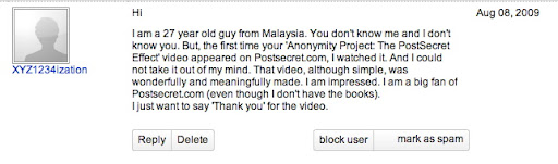 He asked, “This may sound strange, but are you in any way connected to PostSecret?”