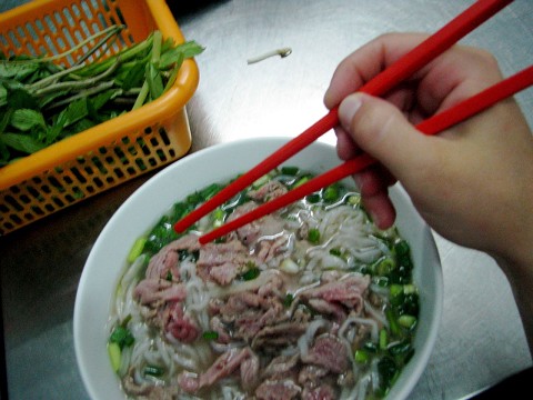 …eating pho (the Vietnamese staple food, a yummy beef noodle soup) with chopsticks (and a spoon for the broth only)