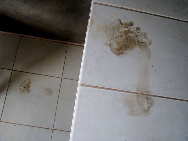 Below: my “CSI Candelaria” shot of the evidence. Muddy footprint on the counter & floor left by Ladron #1.