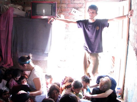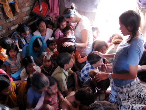 julia and rebecca praying over kids in the slums after leading a little program teaching Bible verses and stories and singing songs