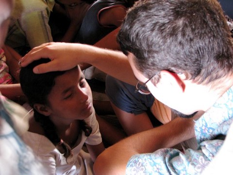 michael leads a final prayer while the others lay hands on the children