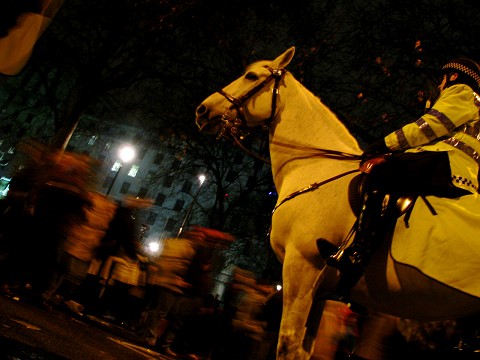 A London copper sits astride her horse keeping watch over the crowds, ensuring no harmful events occur.