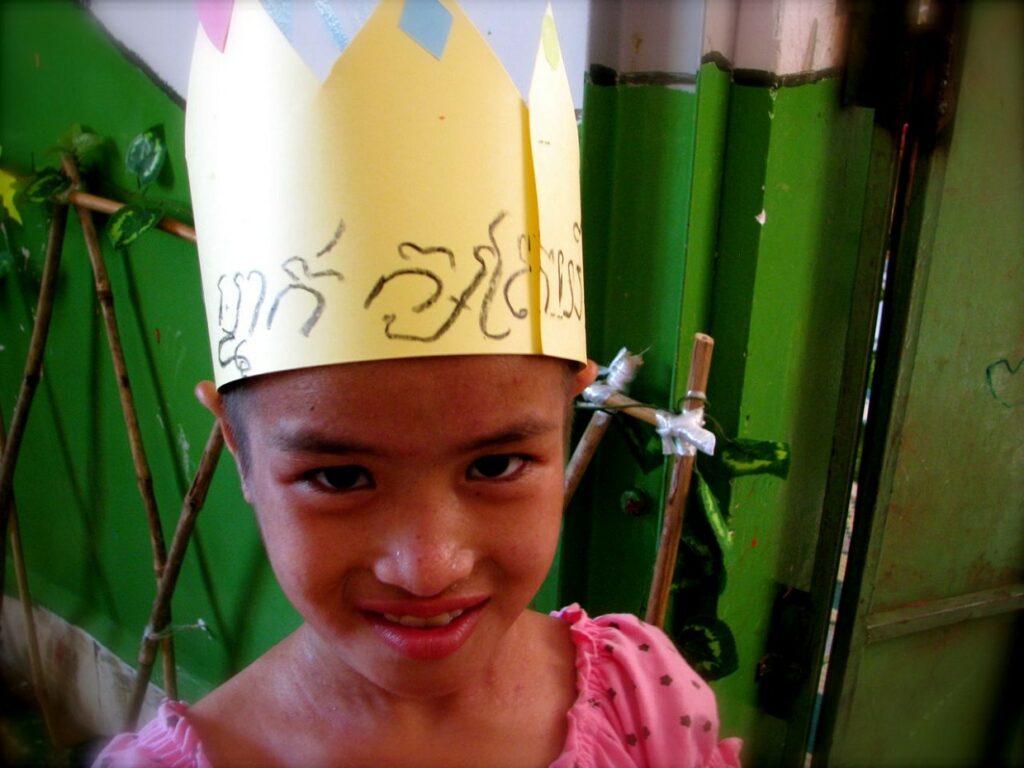 I beckon her towards me and give her an extra big smile as I grab her little hand. All the other kids in the class have already completed making their paper crowns, and have started eating their snack. As I get her situated with her crown materials, two of the other children come alongside me, helping her glue colored paper gems on to it, and writing “princess” around it in Khmer. I’m so glad they helped her!