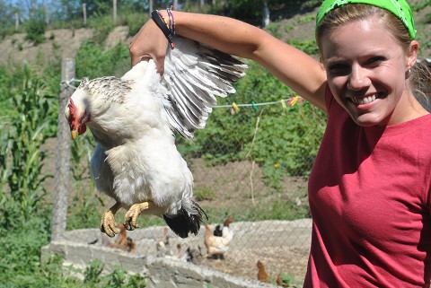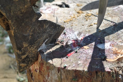 I think the shrill screams of my beloved teammate Carly will forever be engrained in my mind as I swung that axe. I chose a large white chicken with a red mohawk as my prey. It really was a beautiful chicken and I knew it would make for a delicious meal.
