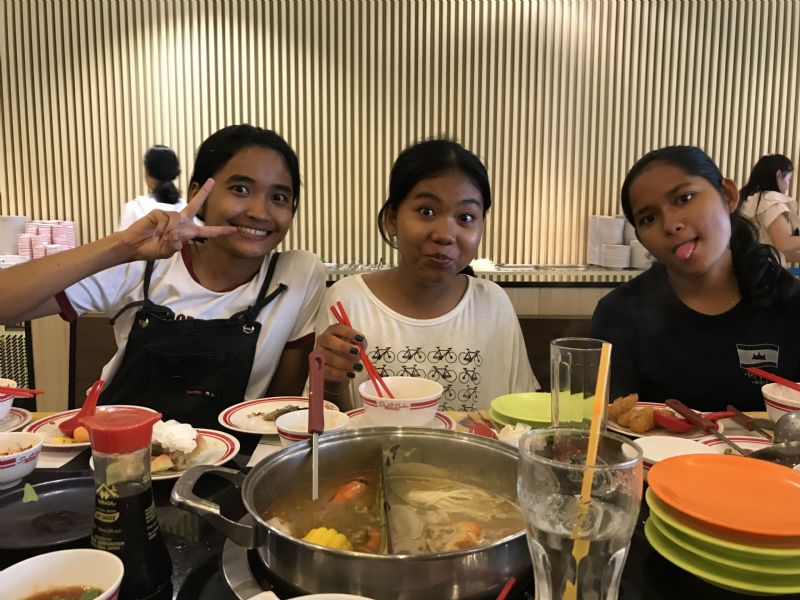 For lunch we went to Shaboo Shaboo, which is best described as Cambodian shady maple, an all you can eat soup place (where stuff to put in your soup comes around on conveyer belts)