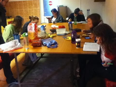 We arrived at a very small house, the boys went for a walk to pray for the area, while Andrea and I went inside. We walked through one very small room and then ended up in the back of the house, which was the bedroom (and the only room with heat- by fire). This small room had 7 women in it. The Bible study began with prayer, then I shared some things that God is teaching me, and then we studied 1 Kings 4…