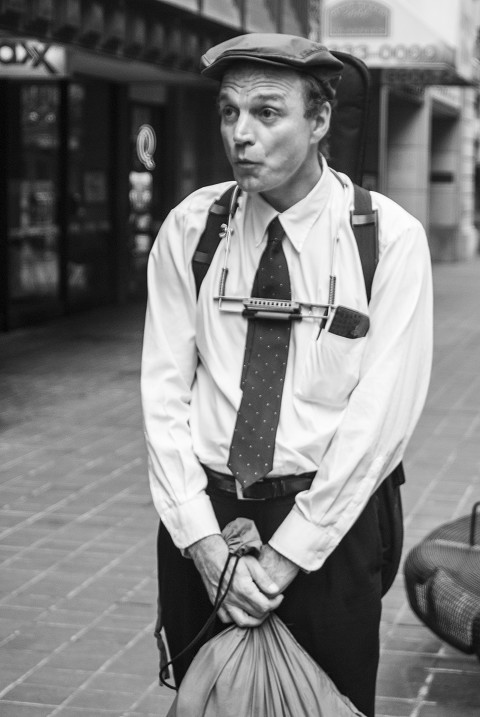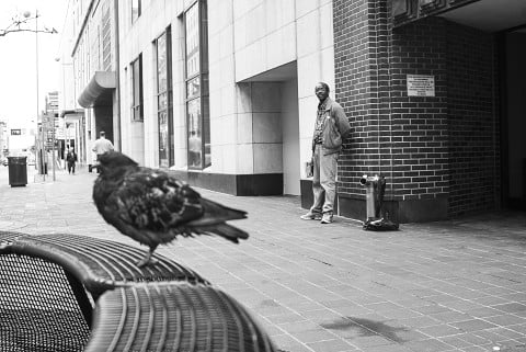 “don’t worry I wasn’t trying to steal your camera.” I looked at him, laughed and explained what I was doing. This man was the only person in the last 20minutes whose eyes made contact with mine, and stayed there. A top hat covered his bald head and if I had taken a head shot of him, no one would have noticed the difference between him and the suits that paced from one building to the next. It was with a further look that caused the averted eyes, because he, like I wore clothes that were just a bit too big, and miss-matched according to society. They might have been a bit older than the fancy suits, and bit more worn. Brian began to share with me his story,