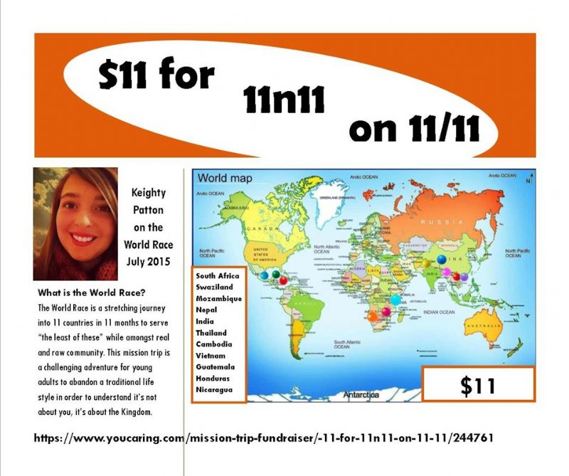 If you would like to donate $11 toward my World Race trip, please click on the link below.