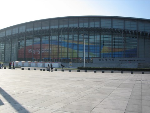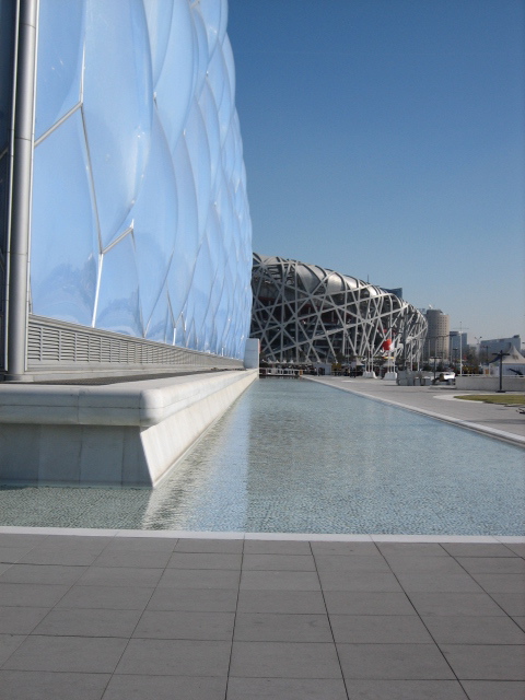 Olympic Stadium: Water Cube on left, Bird’s Nest straight ahead.
