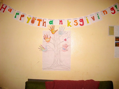 Also, for those who are curious, we had a nice Thanksgiving this past week. We were able to take the day off to relax and have fun together. We were definitely all homesick, but we were able to have fun together watching movies and playing games. For dinner, we had turkey sandwiches, green beans, mashed potatos, and macaroni. Not quite the typical Thanksgiving meal, but close enough. We also made a Thankful tree (our home now officially looks like a third grade classroom), and shared what we were thankful for. We then rang in the holiday season by watching a Muppet’s Christmas Carol on a tiny laptop computer and drinking hot chocolate.