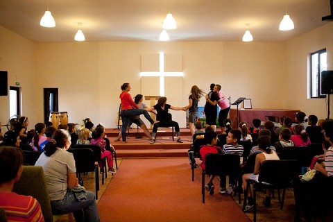 -Getting Unstuck. Our team has done several children's programs each week since we've been here but this week was by far my favorite. We did a skit called “Stuck”. The basic premise is this… Someone walks up to a chair labeled “SIN”, ignores the sign and sits in it anyway. They then try to get up from the chair and realize they are STUCK in SIN. Clever, riiiight? As people walk by they try to help the stuck person and consequently get stuck themselves. Finally Jesus (or in our case Amanda) comes and saves them from their sin/unsticks them from the chair. The kids LOVED it. They thought it was absolutely hysterical (as did I). Not to mention, the message is SO simple but SO true. Here is a picture of the skit…