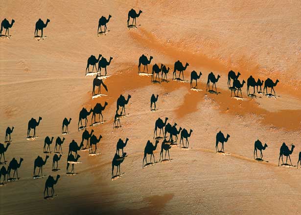 I recently found a picture online of a herd (?) of camels walking at sunset. The picture was taken directly above the herd and the shadows of the camels on the sand are HUGE. But you would never know they were shadows unless you zoomed in on the picture as the caption mentions. Tiny brownish specks dot the sands of Saudi Arabia and the angle of the sun helps paint the beautiful picture of large camels walking along the sands.