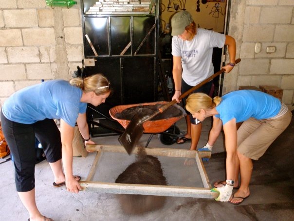 levels of sifting. Large gravel, medium gravel, small gravel, and fine sand were separated, washed and layered into the water filters.