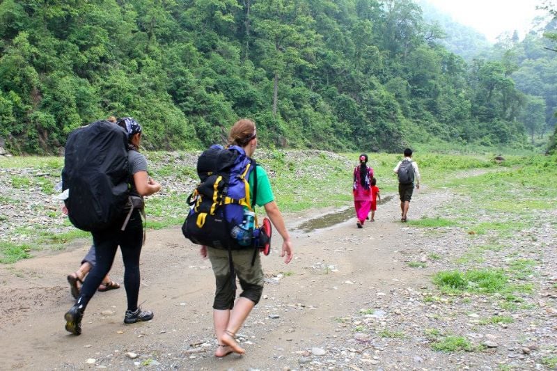 Some sections of the path were fairly easy and required no concentration at all. Conversation came lighthearted and easily escaped out of lungs filled with fresh air- a nice contrast to the smog we had gotten used to inhaling from the heavily populated city of Kathmandu. We could admire the gorgeous views of the mountains (or foothills as the fit Nepali insisted they were called. “If there is no snow, it is a foothill.”) We could play in the river on our breaks and relax and take the closest thing we would get that week to a shower in the river or under the waterfalls.