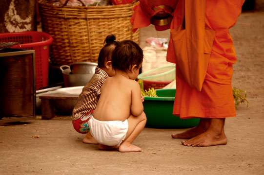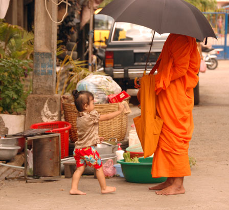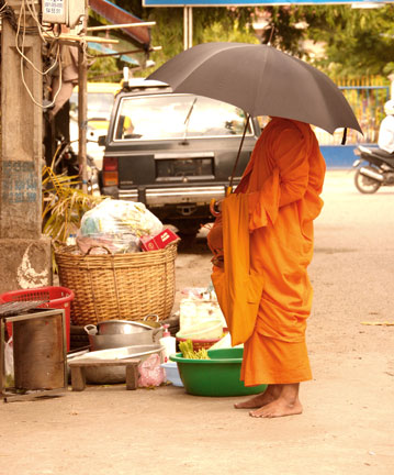 Okay, so I know I said I was going to stop blogging every day once I turned 28, but yesterday (my birthday) I saw something that I just had to show you. God blessed me to catch it on camera as well. I was walking around trying to catch some good pictures of monks, and as I was rounding the corner to walk back into the building where I stay and I noticed a monk standing outside the home next door. This is what the monks do. They stand outside until someone comes out to pray in front of them and give them money.