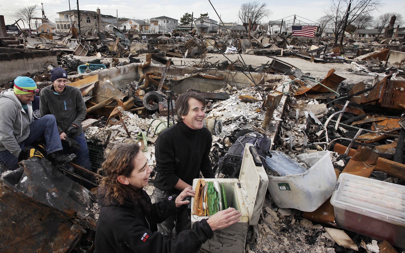 | Rosemary McDermott and her husband Anthony Minor react as they open a safe containing a family genealogy they were able to salvage from the basement of her mother's home in the Breezy Point section of the Queens borough of New York, Thursday, Nov. 15, 2012. A fire destroyed more than 100 homes in the oceanfront community during Superstorm Sandy. On the left are Todd Griffin and Kevin Striegle, volunteers with Adventures in Missions, who helped find the safe beneath the rubble. (Mark Lennihan / AP) |