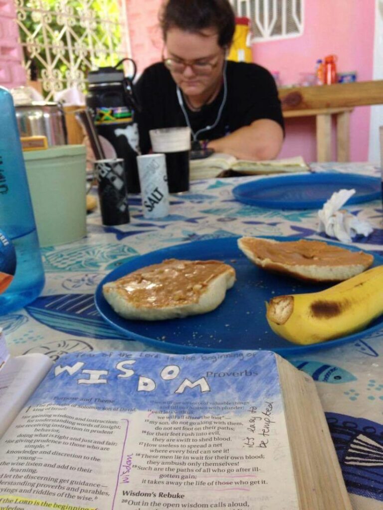 A roll with peanut butter, and fresh mango and banana from our tree in the yard. I spend some time reading Proverbs and journaling. I then take a quick shower.
