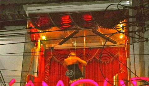 these glass boxes above the chaos are girls dancing. Alright, there are girls everywhere dancing but