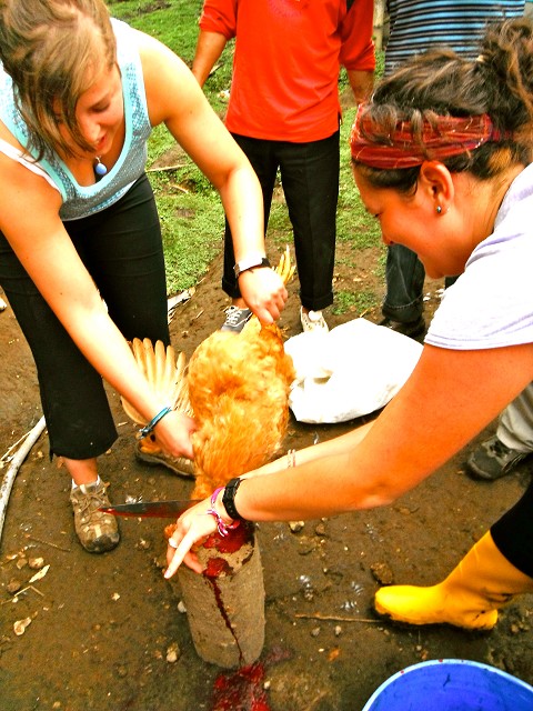 and I were in charge of killing these live chickens with a knife. Scariest thing I’ve ever done. Holding the