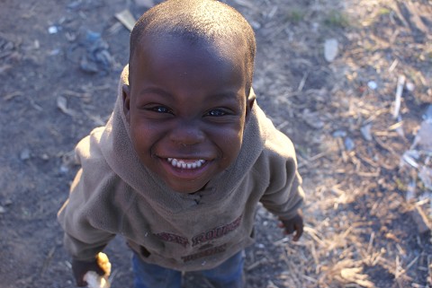 A sweet child in a South African squatter camp, smiling becuase his belly is full of Viennas (hot dogs)