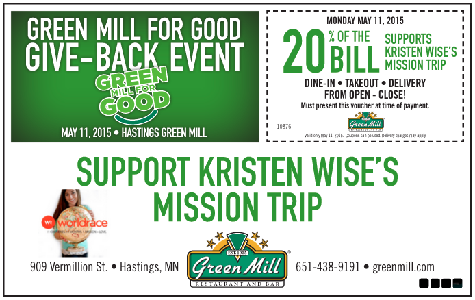 On May 11 Green Mill in Hastings is hosting a fundraiser to help me raise money for my mission! If you go to green mill, order take out or delivery, 20% of the proceeds will go to mission trip if you bring the voucher shown in the image below. (Please right click on the image to copy/paste or print it, or email me for a copy) You must present the voucher at the time of payment, so please don’t forget to bring it with you!