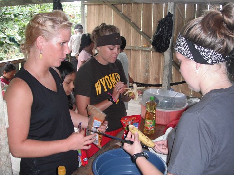 Making Chocolate Monos (monkeys) – a snack we invented that consists of bananas & plantains soaked in liquidy chocolate infused with cinnamon.