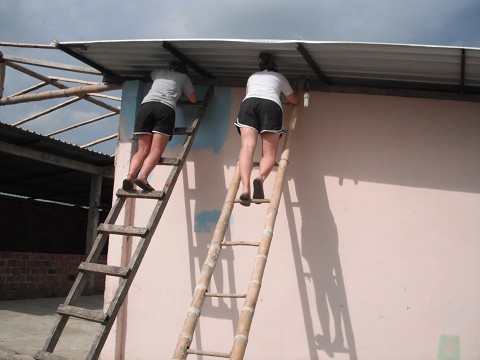 Painting the front of the church… using the wobbliest ladders I've ever stood on.