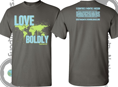 I've partnered with an amazing team at Fund the Nations to create a custom t-shirt for my amazing and generous support team! The shirt lists the 11 countries that I will be visiting as well as my website on the back. This is in case anyone asks you what is the shirt/world race about, where will I be traveling, or who the heck is Kristina Smith?? On the front I have an awesome, non-traditional picture of the world with the saying "LOVE BOLDLY". For me, this mission trip has always been about love, and I believe that is what God wants our worlds to revolve around. I want to make that clear to anyone who asks me what I will be doing on this mission trip. The bible says that only Faith, Hope, and Love will remain … but the greatest of this is LOVE (1 Corinthians 13:13). I've made it my mission in life to strive to Love Boldly every day. I also want to encourage others to do the same, so I've made that the theme of my t-shirt's design.