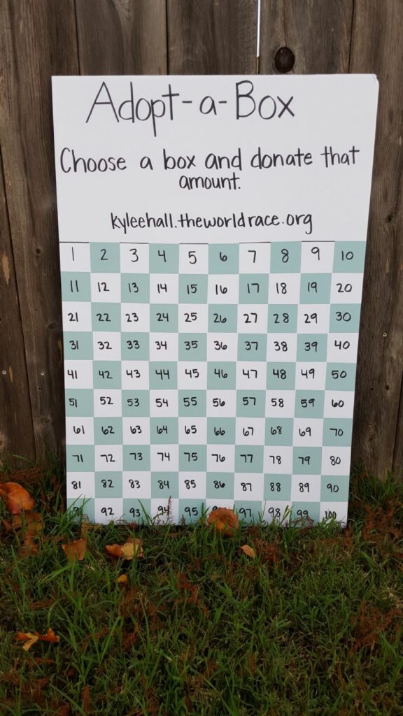Adopt-a-Box is a social media fundraiser in which you choose a number and donate that amount. For example, if you chose box 19, you would donate $19. If you chose box 78, you would donate $78. Every time a box is “adopted,” it will be crossed off. I will post picture updates regularly. To donate for this fundraiser, you can do it either online or in person. In order to get the tax information, please donate through my blog.