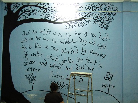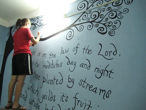 While serving in Cambodia my team once again had the awesome opportunity to paint another mural, this time in our students classroom! We glady took our contacts up on it and Jeannie and I worked together to create the simple but meaningful mural you see...