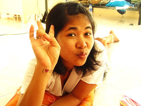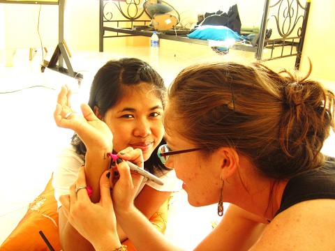 Well, the other day she finally said yes and drove over to SHE on her moto bike to hang out with Carmen, Bethany, and I. She has such a beautiful spirit. A year ago if you would have told me I would be hanging out in bars, befriending men drinking their nights away, or loving on girls stuck in prostitution I would have been shocked. But it is exactly where God has placed me. Ice and us girls spent time just talking, eating leftovers in one of the kitchens, watching the other girls bake cookies, drawing pictures, coloring pretend tattoos on eachother and doing our hair. We hung out like I would hang with friends back home.