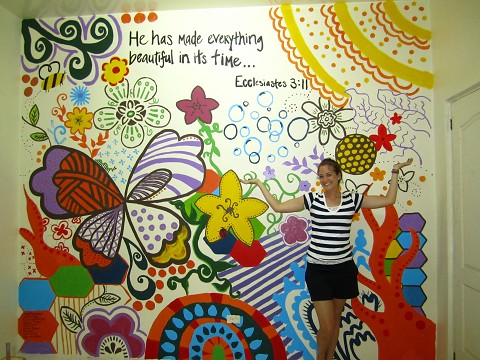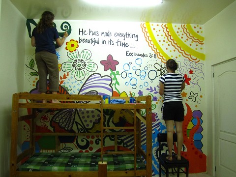 I started on the overwhelmingly large white wall all by myself. I was frustrated in the first 15 minutes at the drippy, goopy paint, and crappy paintbrushes. I continued for a while myself but tired quickly and went back to my room to take a break where Janell asked what I was doing. I told her I was painting a mural and asked her if she’d like to join me…It shouldn’t be that hard, but I really don’t like asking for help. God told me to humble myself and ask, so I did.